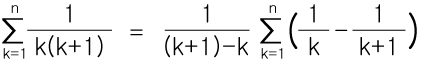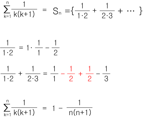 부분분수에 의해 1/2*3 = 1/2-1/3 가반복되어 +n-n=0로 양끝의 1-1/n만 남게 됩니다.