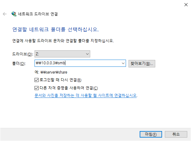 \\<루프백 ip>\<서버에서 smb.conf 만질때 추가했던 [smb 이름]>