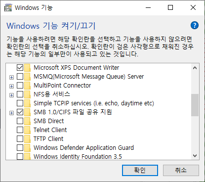 SMB 1.0/CIFS 파일 공유 지원을 체크한뒤 확인을 누르면 됩니다.