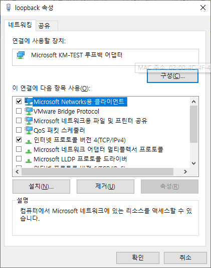NetBIOSE 체크표시만 수정 하면 하면 loopback 설정은 끝났습니다.