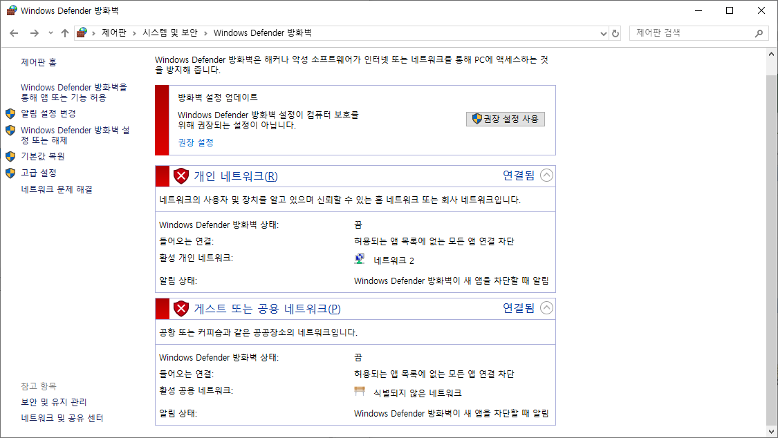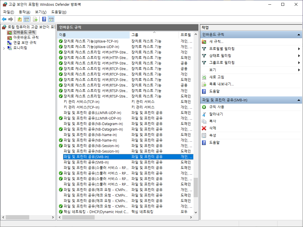 제어판>시스템 및 보안>Windows Defender 방화벽>고급 설정>인바운드 규칙