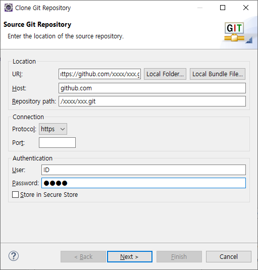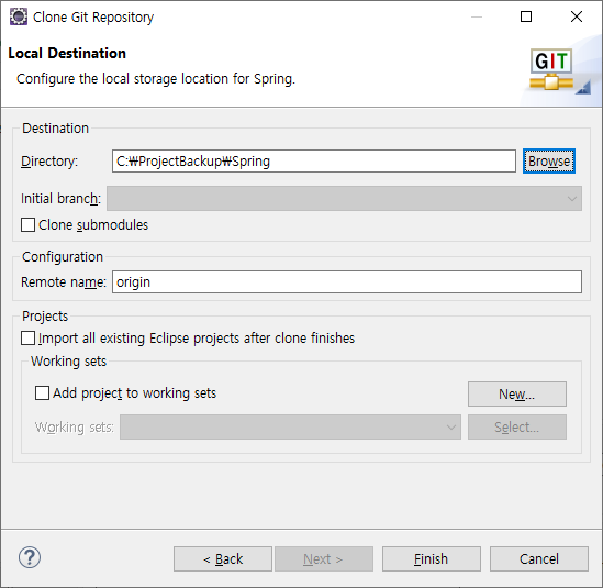 프로젝트에 만들어둔 백업 폴더를 지정해주고 Finish 해줍니다.