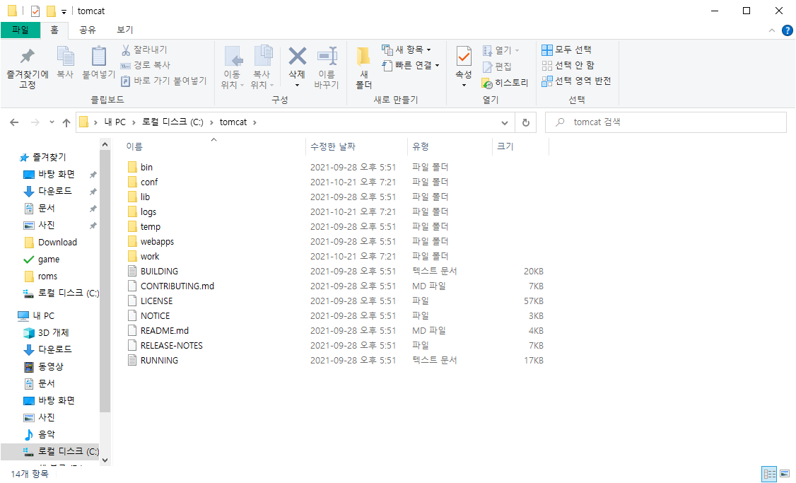 (저같은 경우엔 폴더의 이름은 임의로 tomcat 이라 바꿨습니다.)