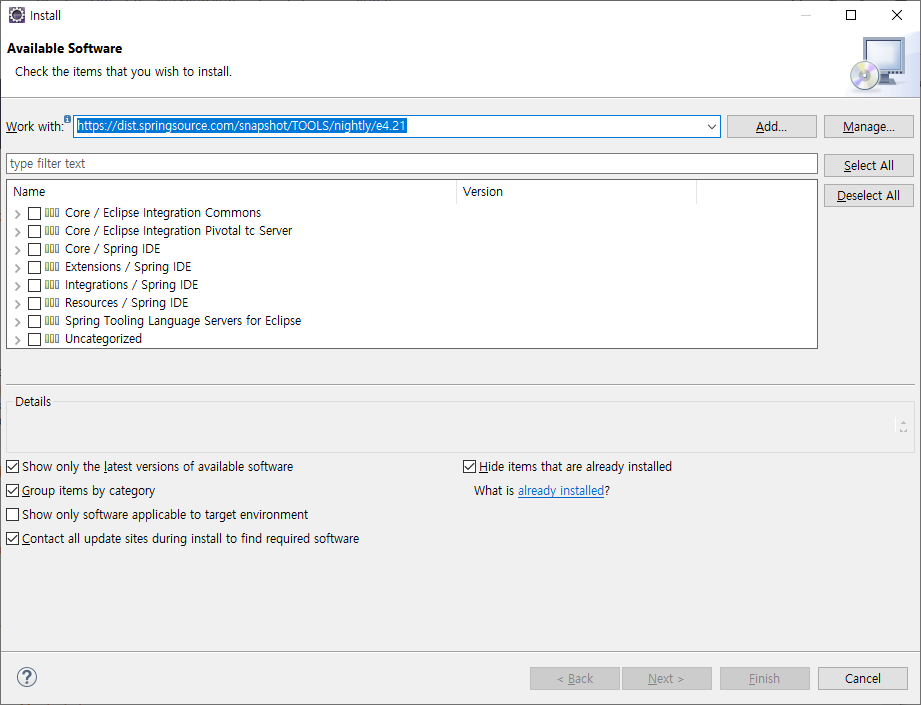 버전에 맞는 STS를 설치 했음에도 lagency 항목이나 MVC 항목이 존재하지 않는다면.
