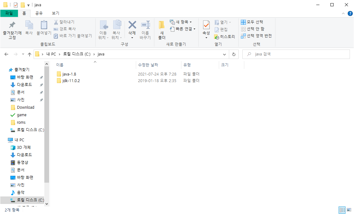 C: 드라이브에 java 폴더를 만들고 안에 두개의 JAVA 폴더를 넣어줍니다.