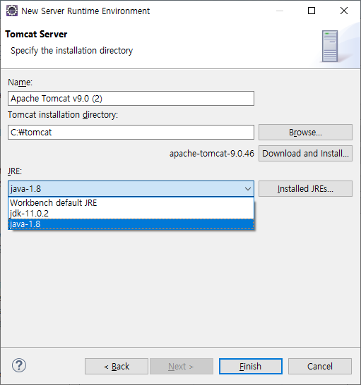 Browse 버튼으로 tomcat 폴더를 지정해주고, JRE 를 1.8 버전으로 설정해줍니다.