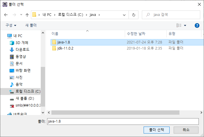 다운로드 받은 자바폴더를 선택한 뒤에