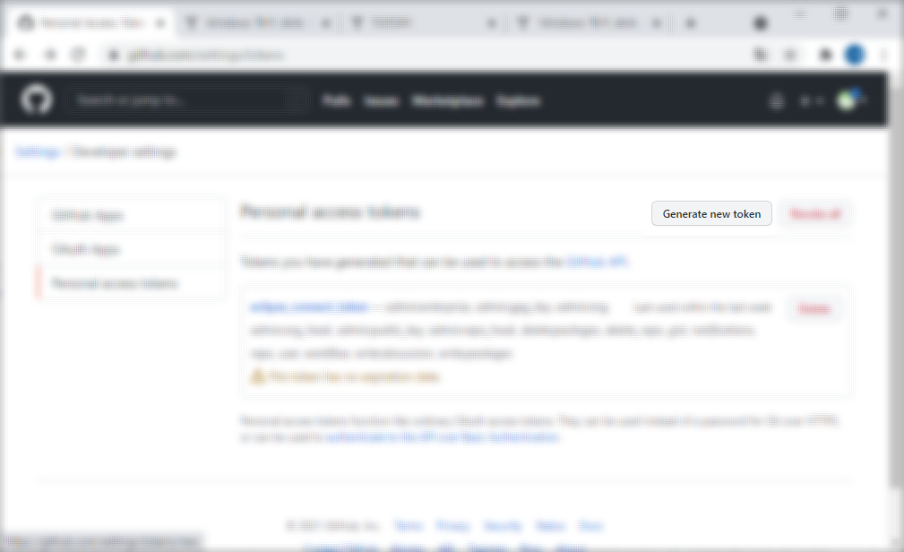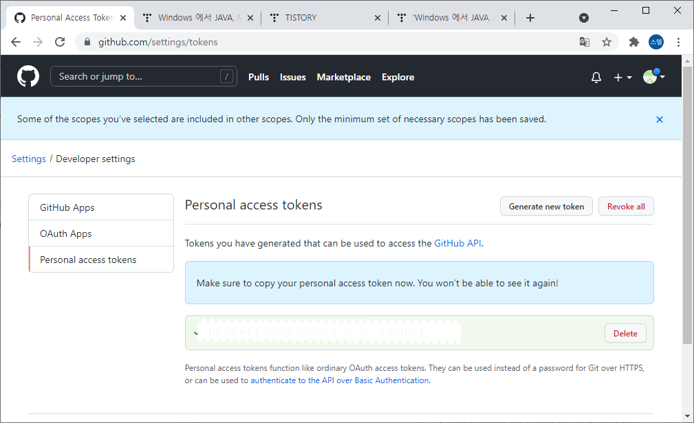토큰 문자열은 페이지를 종료하면 그 후로 다시는 확인할 수 없으므로 다른곳에 적어두거나 복사해 두시길 바랍니다.