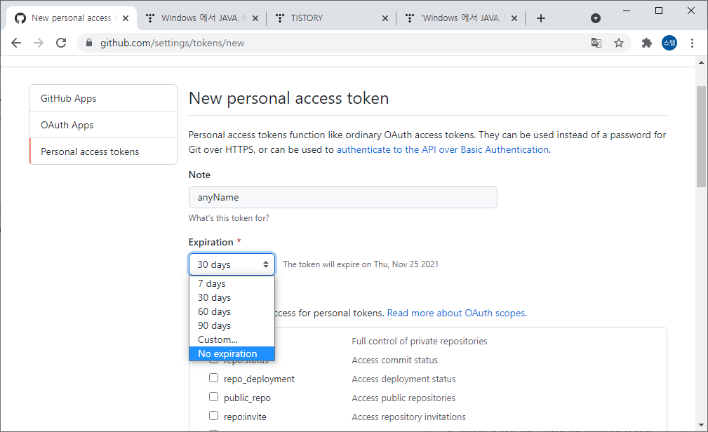 여기에서 모든 체크표시에 v (혹은 임의 체크표시에 v) 하고 토큰을 생성해줍니다.