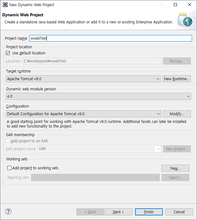 Target Runtime 이 Tomcat 인지 확인한 후에 Finish를 눌러서 프로젝트를 생성합니다.